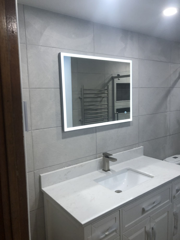 - Nous posons vanité, armoires, miroir et accessoires de rangement.